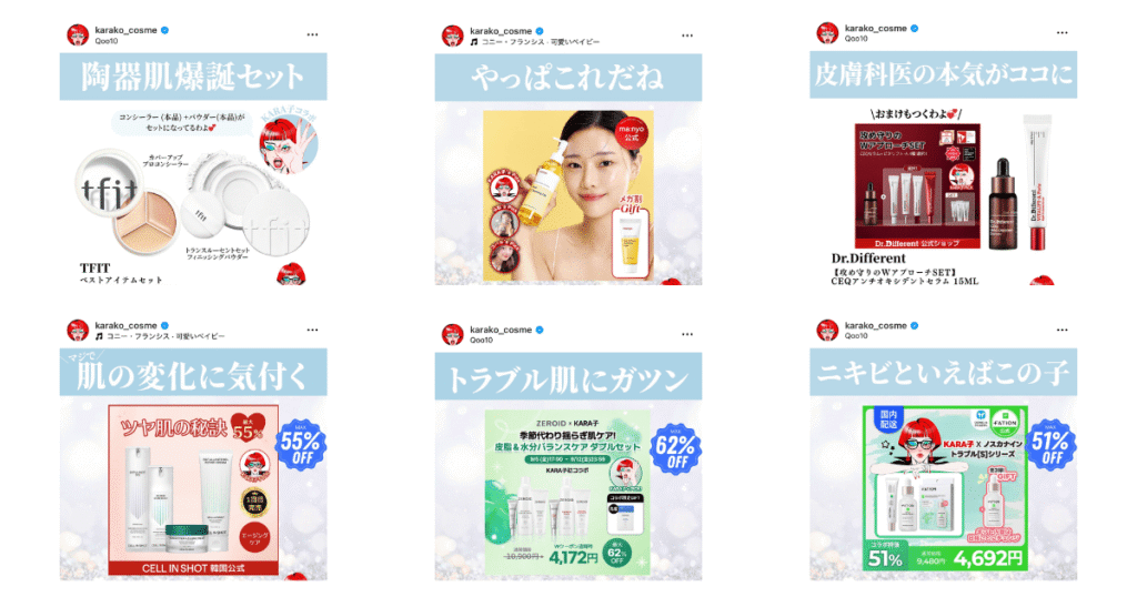 画像の例は全て、ECサイト「Qoo10」のメガ割というセール期間にインフルエンサーとのコラボセットを販売し、成功をおさめたものです。