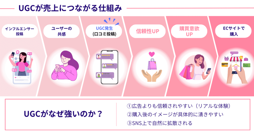 特に近年では、企業発信の広告よりも「UGC(ユーザー生成コンテンツ)」が購買行動に大きく影響する時代です。